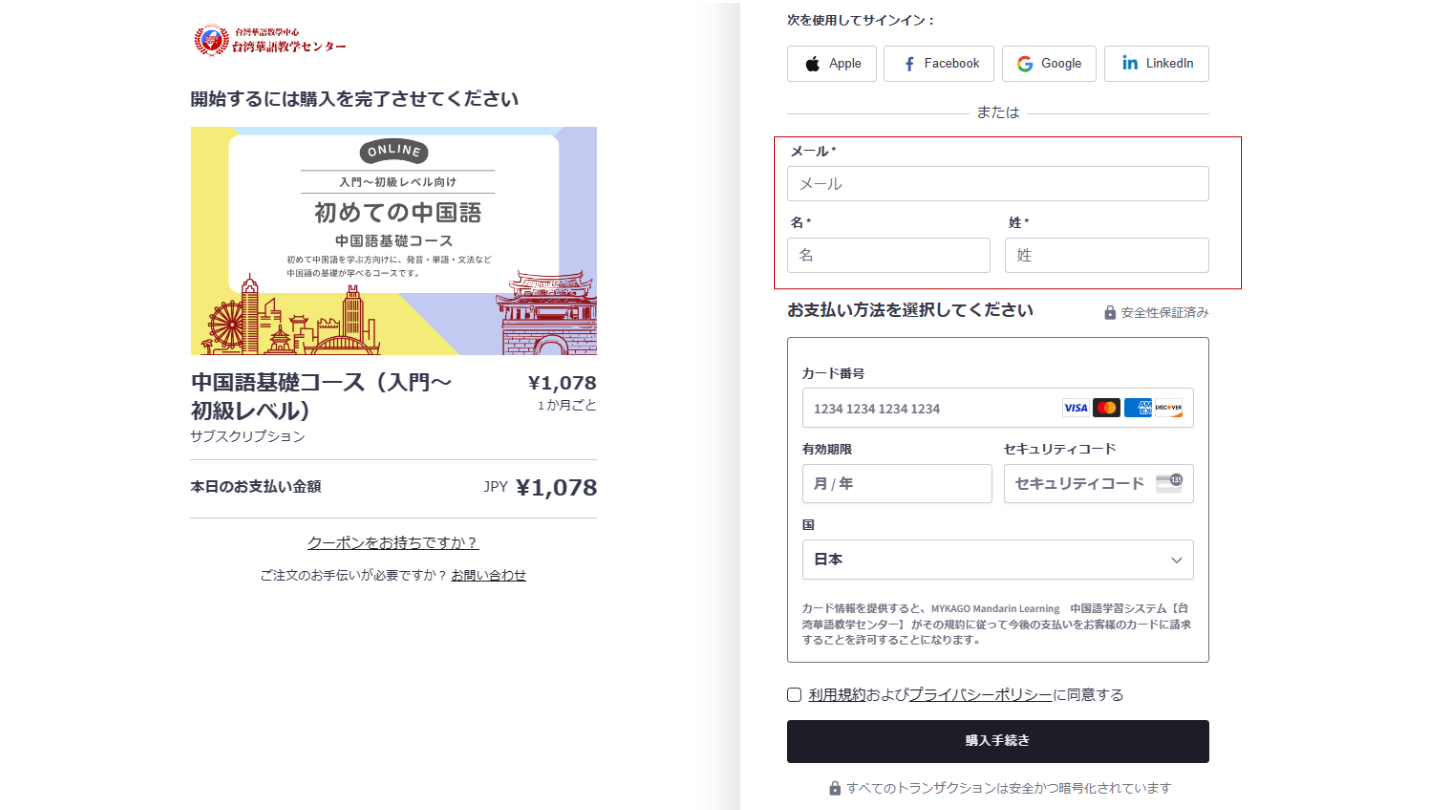 MYKAGO Mandarin Learningの利用登録ページから黒いボタンで表示のある【利用登録する】もしくは【購入】ボタンを押し、利用登録を行ってください。