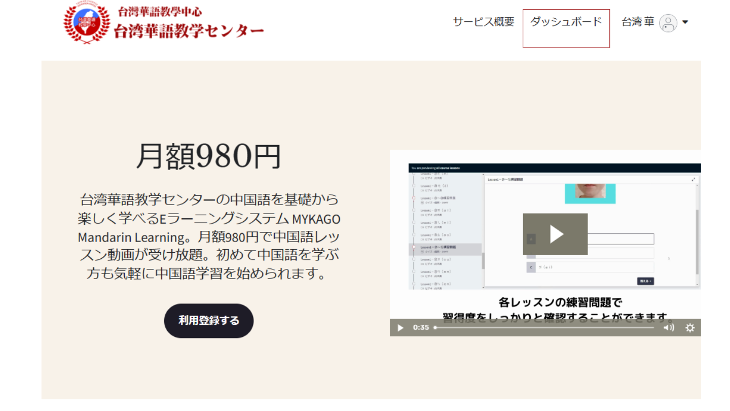 MYKAGO Mandarin Learningの利用トップページに戻り、【ログイン】した後に、【ダッシュボード】をクリックしてください。