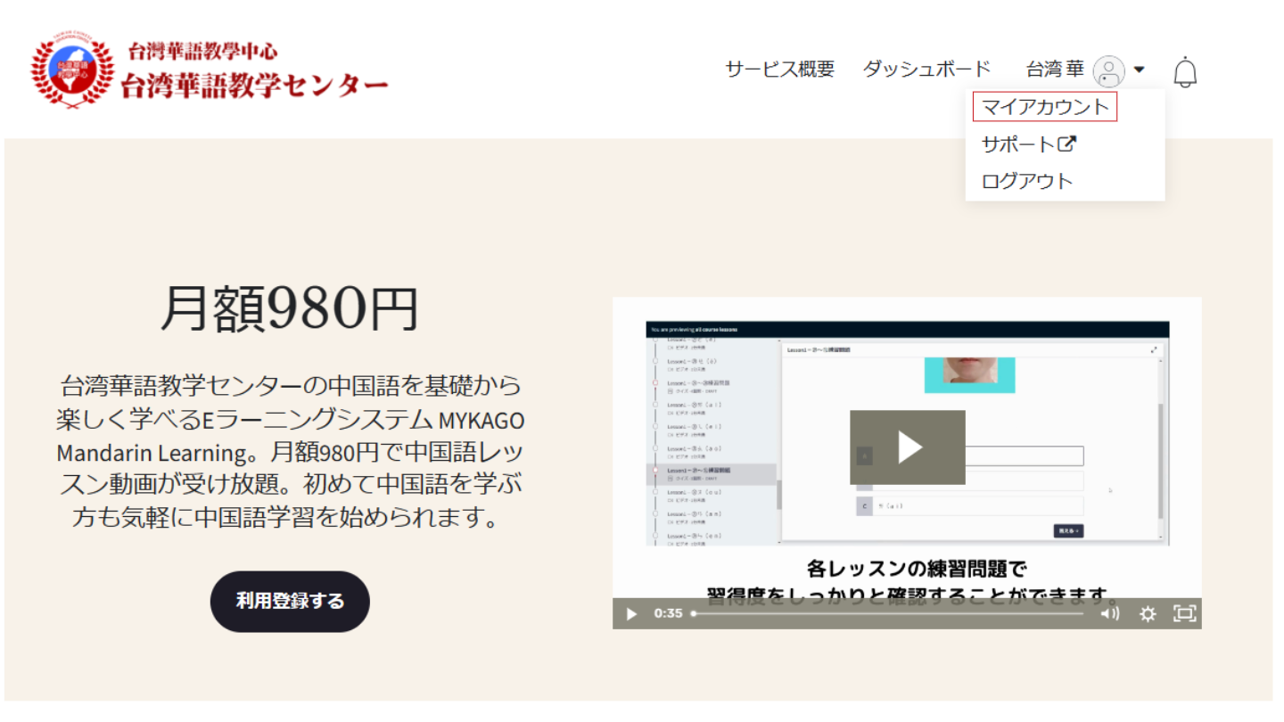 MYKAGO Mandarin Learningにログインし、トップページにあるプロフィール画像をクリックした後、【マイアカウント】をクリックしてください。
