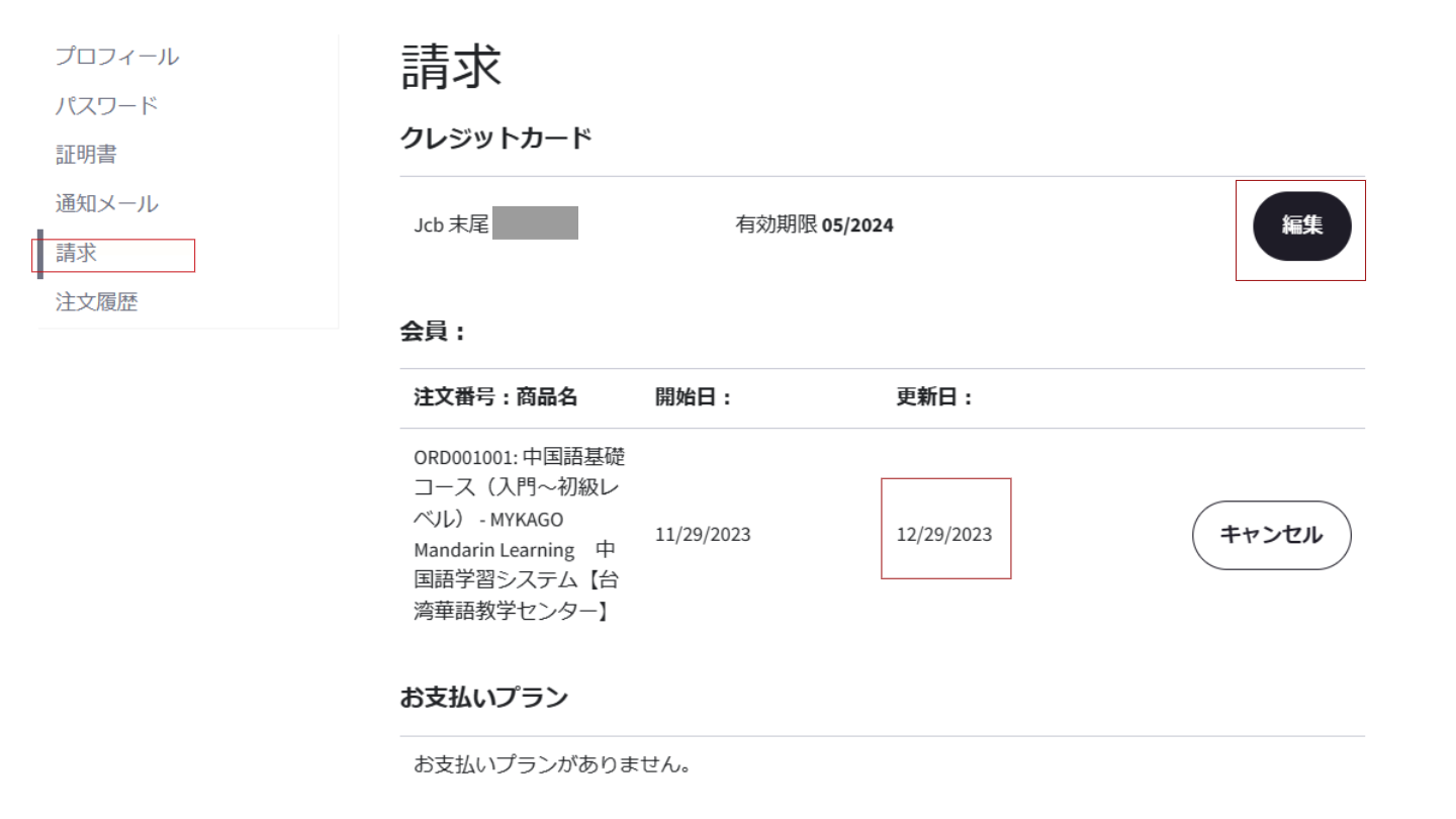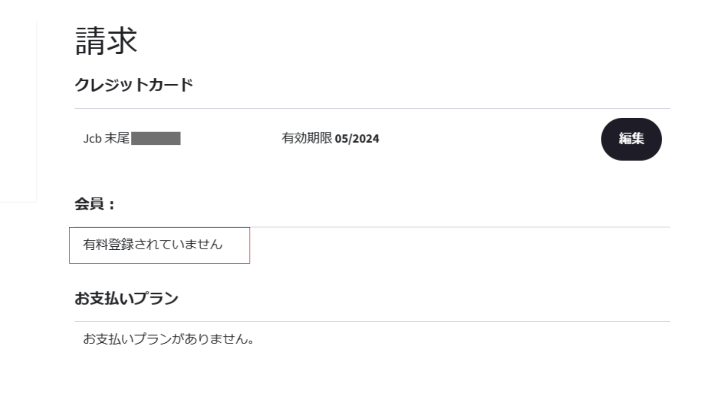 ・お支払い方法の確認・変更ー【】お支払いいただくクレジットカードの確認や変更は【編集】ボタンをクリックしてください。