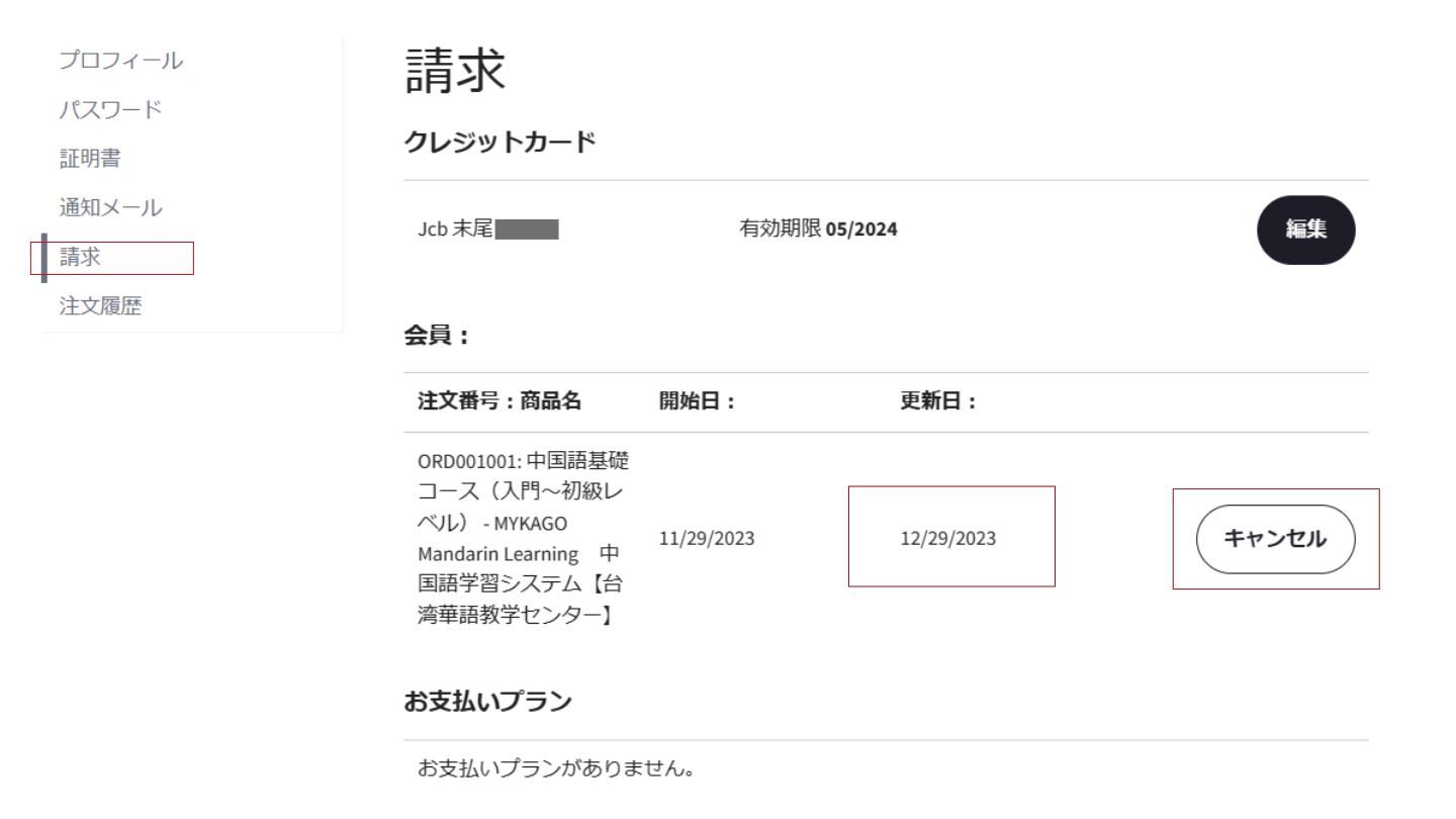 左メニュー欄の中から【請求】を選びクリックしてください。【会員:】の項目内にある【キャンセル】ボタンを押してください。