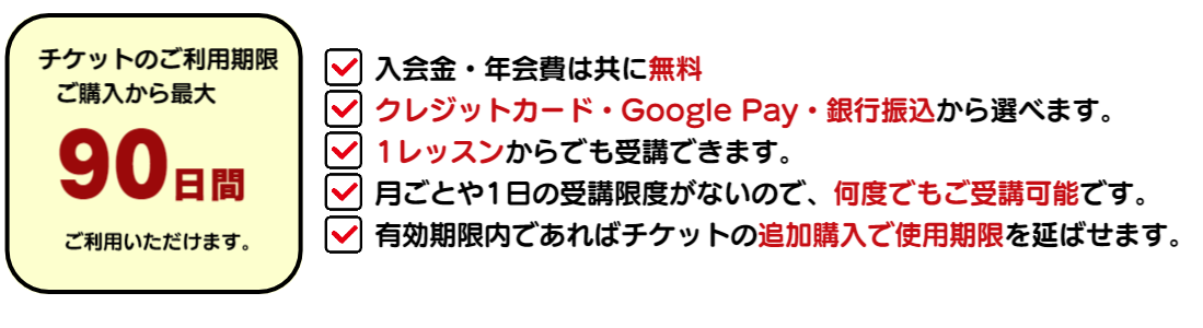 レッスンチケットのお支払いはクレジットカード決済・Google Pay・銀行振込からお選びいただけます。