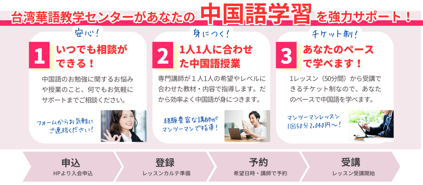 1回50分間のマンツーマンレッスン。初めて中国語を学ぶ入門レベルから上級者まで対応。繁体字・注音符号・簡体字・ピンインから選んで受講できます。お子様のレッスン・大学受験対策・中国語試験対策・台湾語・ビジネスなど様々なレッスンに対応。
