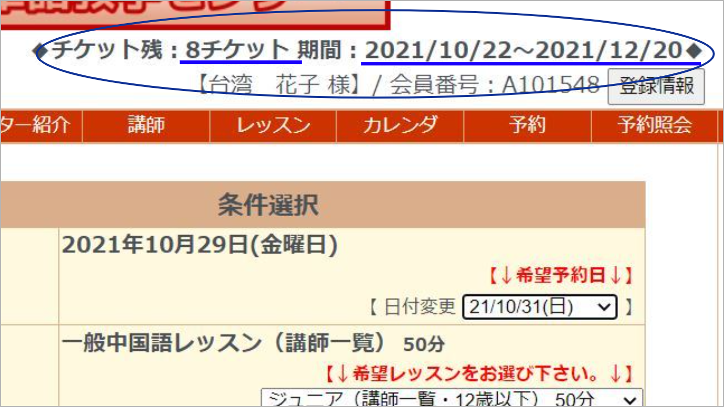 チケット数が0枚と表示される場合はご予約ができません。チケット枚数が1枚以上残っていることをご確認ください。チケットの有効期限内であれば有効期限より先の日時で予約することも可能です。但し有効期限が過ぎた時点で、レッスンの取消や新たなご予約は不可となり、ご予約いただいたレッスンのご提供のみとさせていただきます。