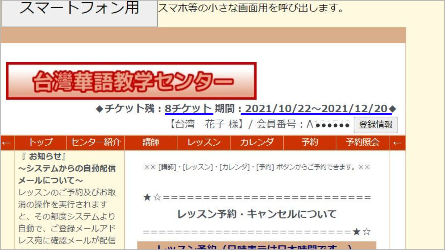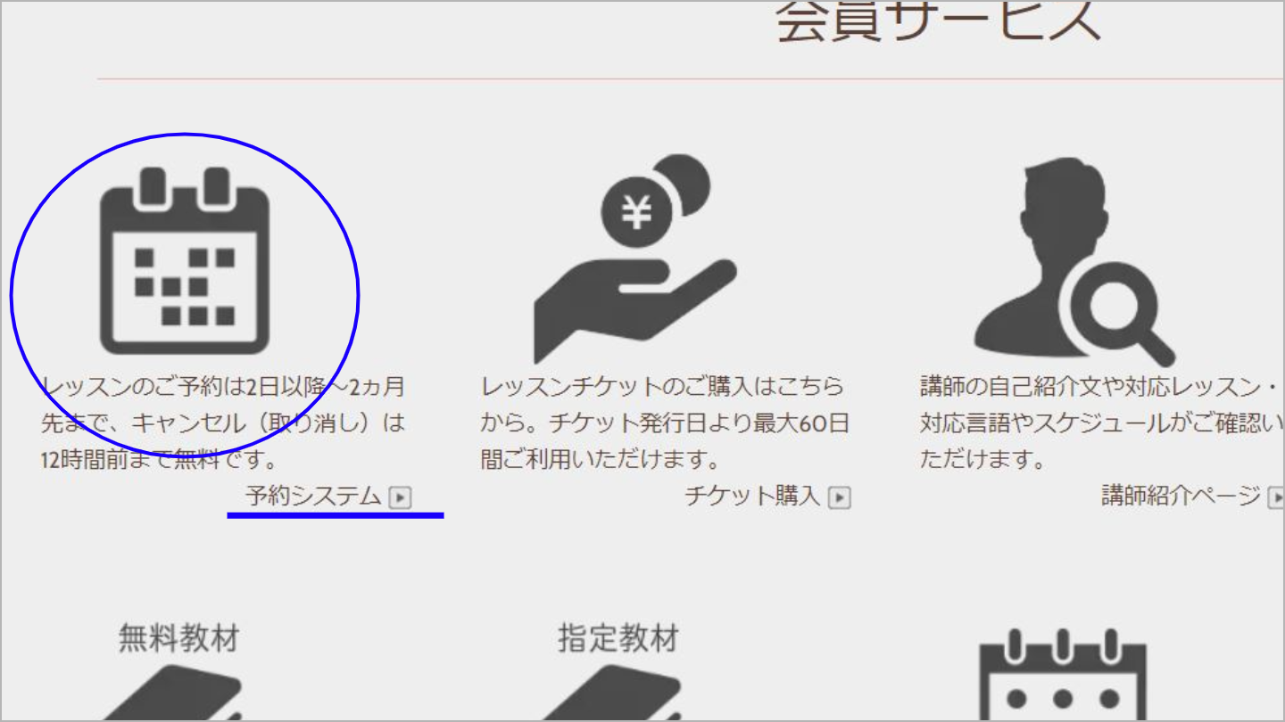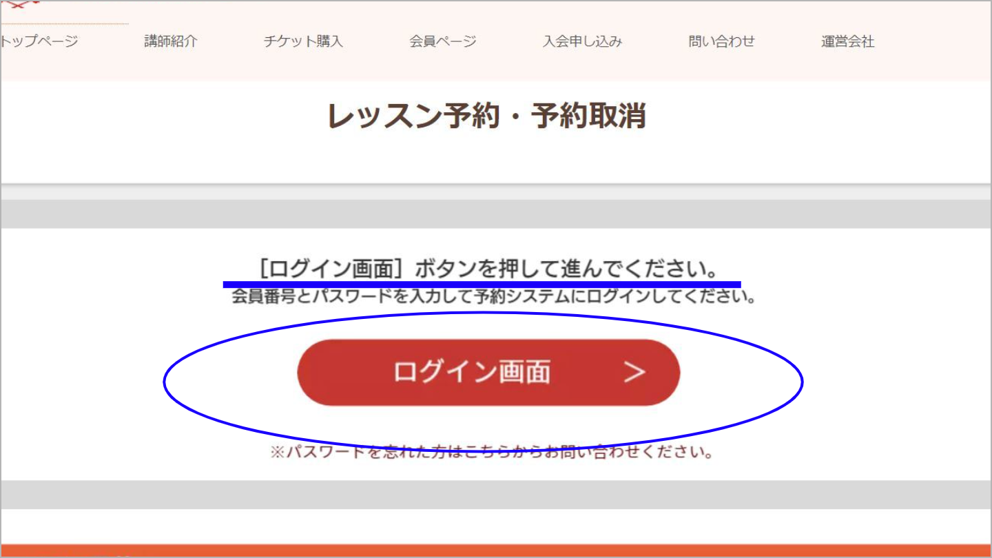1)「会員ページ」内にある「レッスン予約」をクリックしてください。