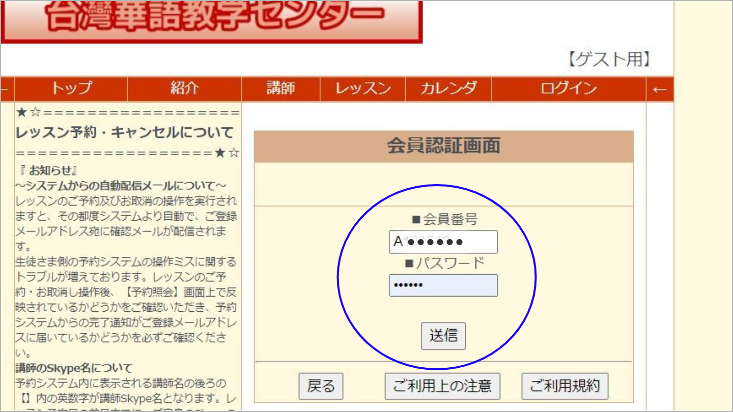 3)「会員番号」・「パスワード」で予約システムにログインしてください。