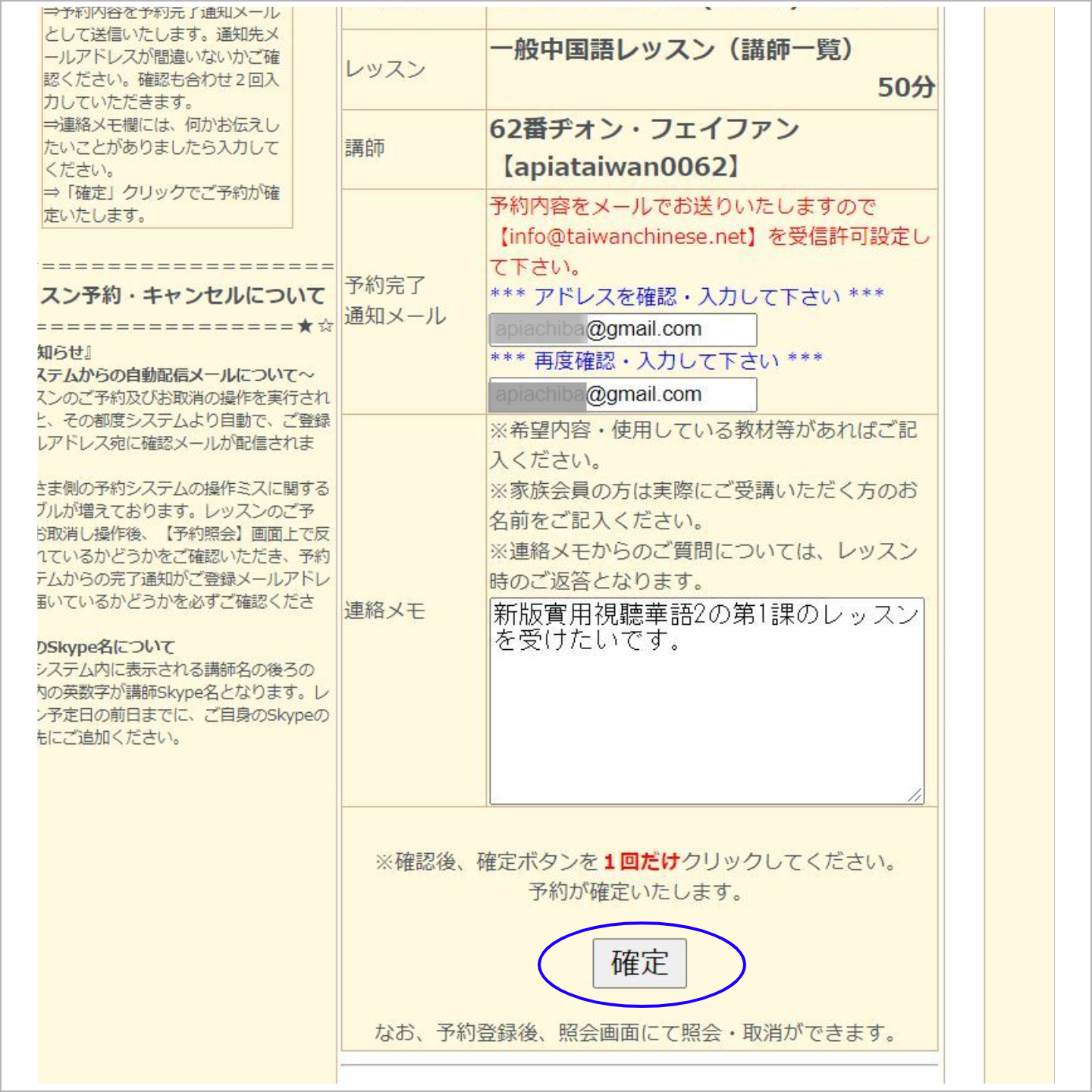 8)予約内容(日時・講師等)を確認の上「確定」ボタンをクリック。