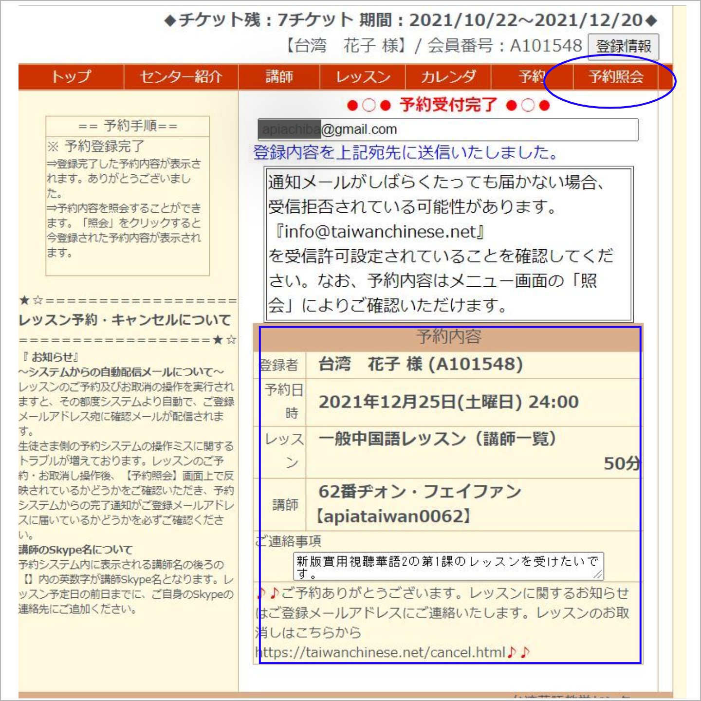 予約が完了すると自動確認メールがご登録のメールアドレス宛てに送信されます。これでレッスンのご予約が完了となります。