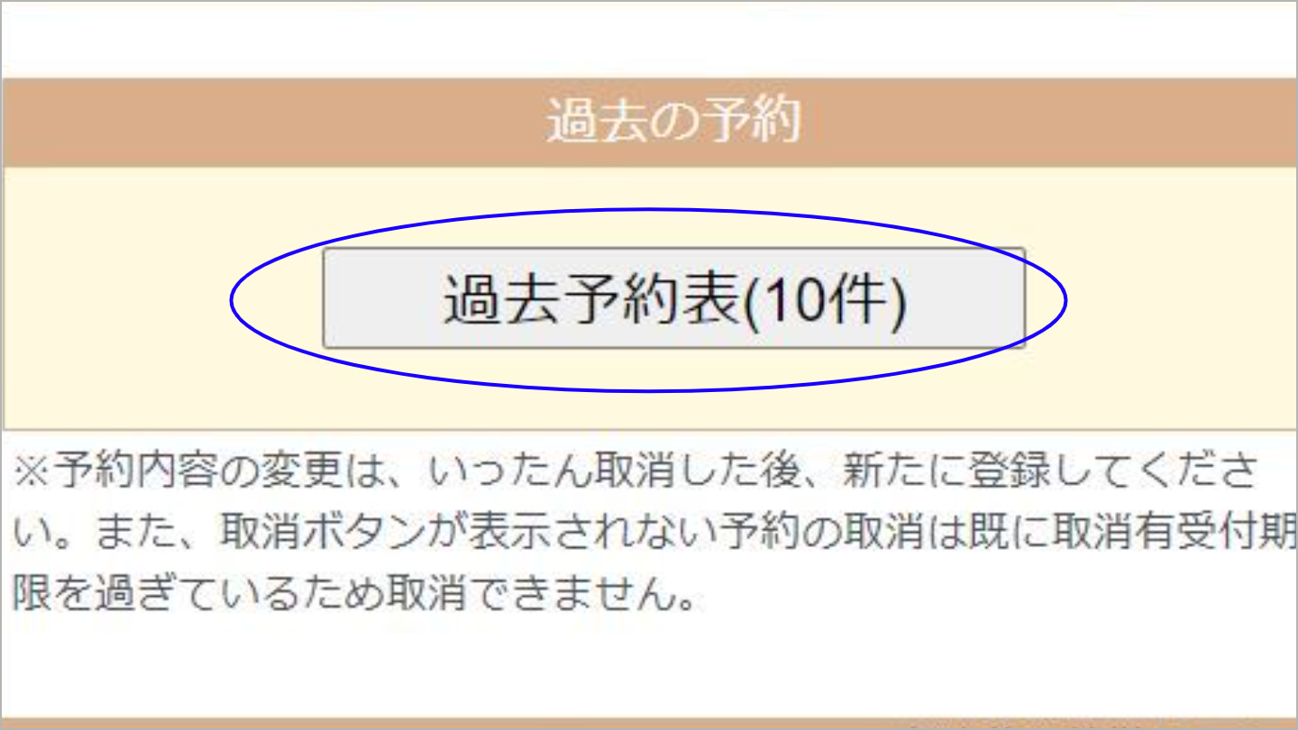 「予約照会」画面の下の方にある「過去予約表」ボタンをクリックすると、過去に受講したレッスン履歴がご確認いただけます。