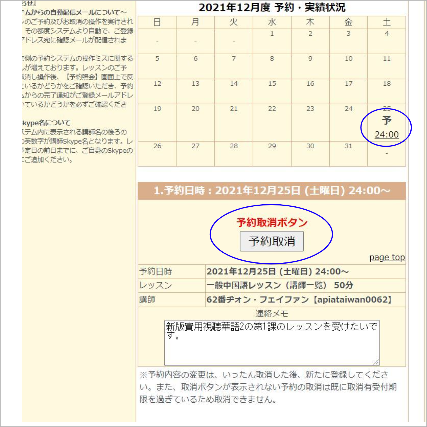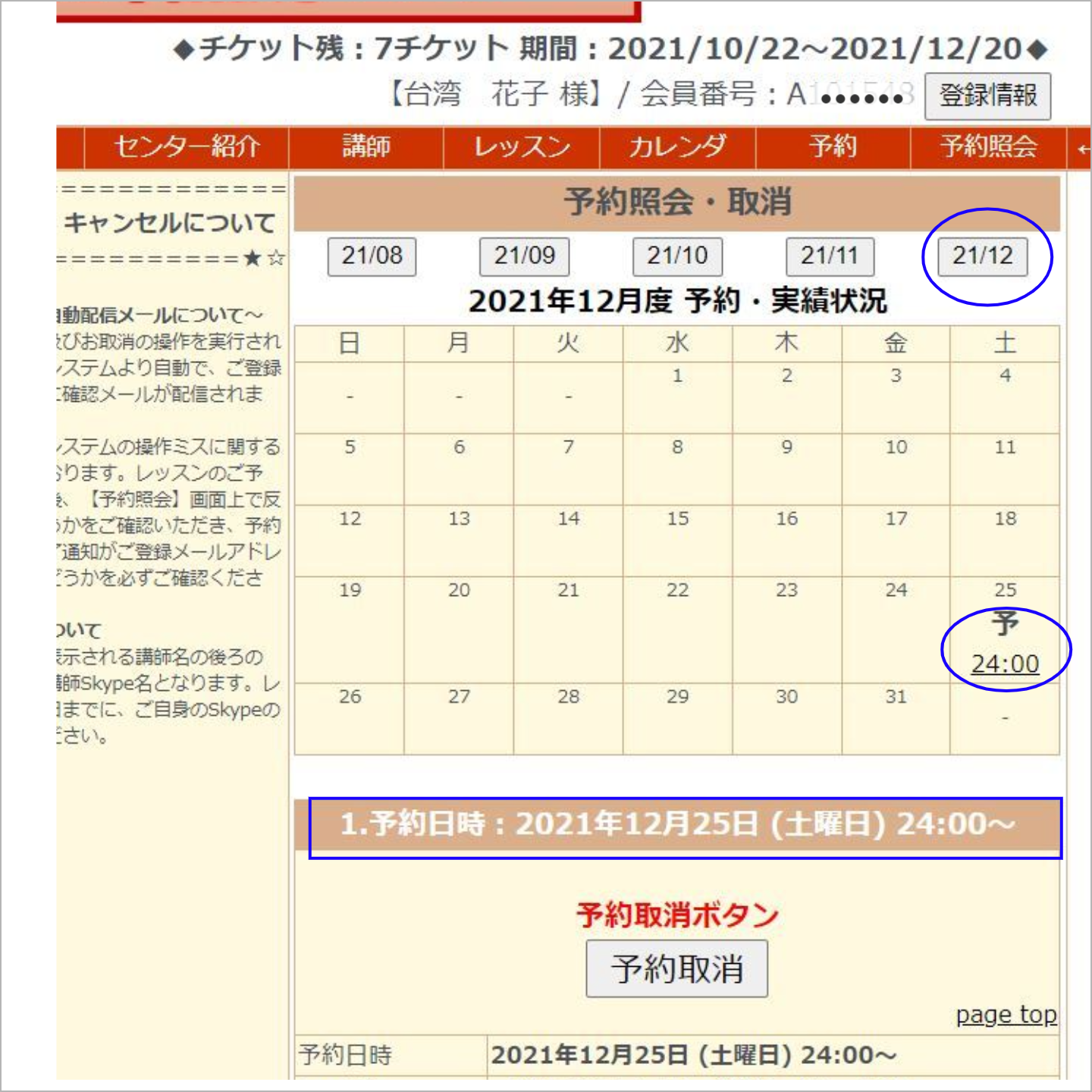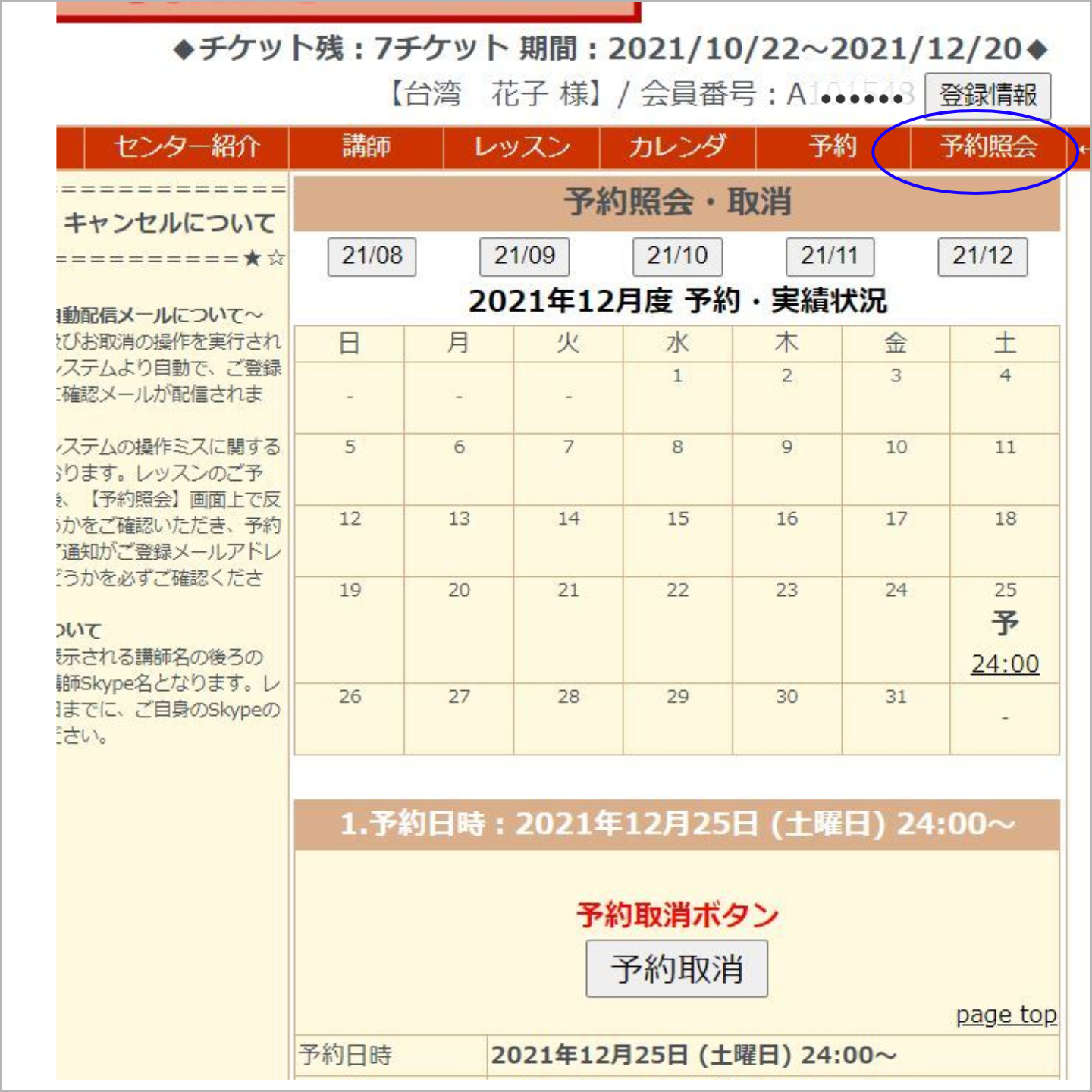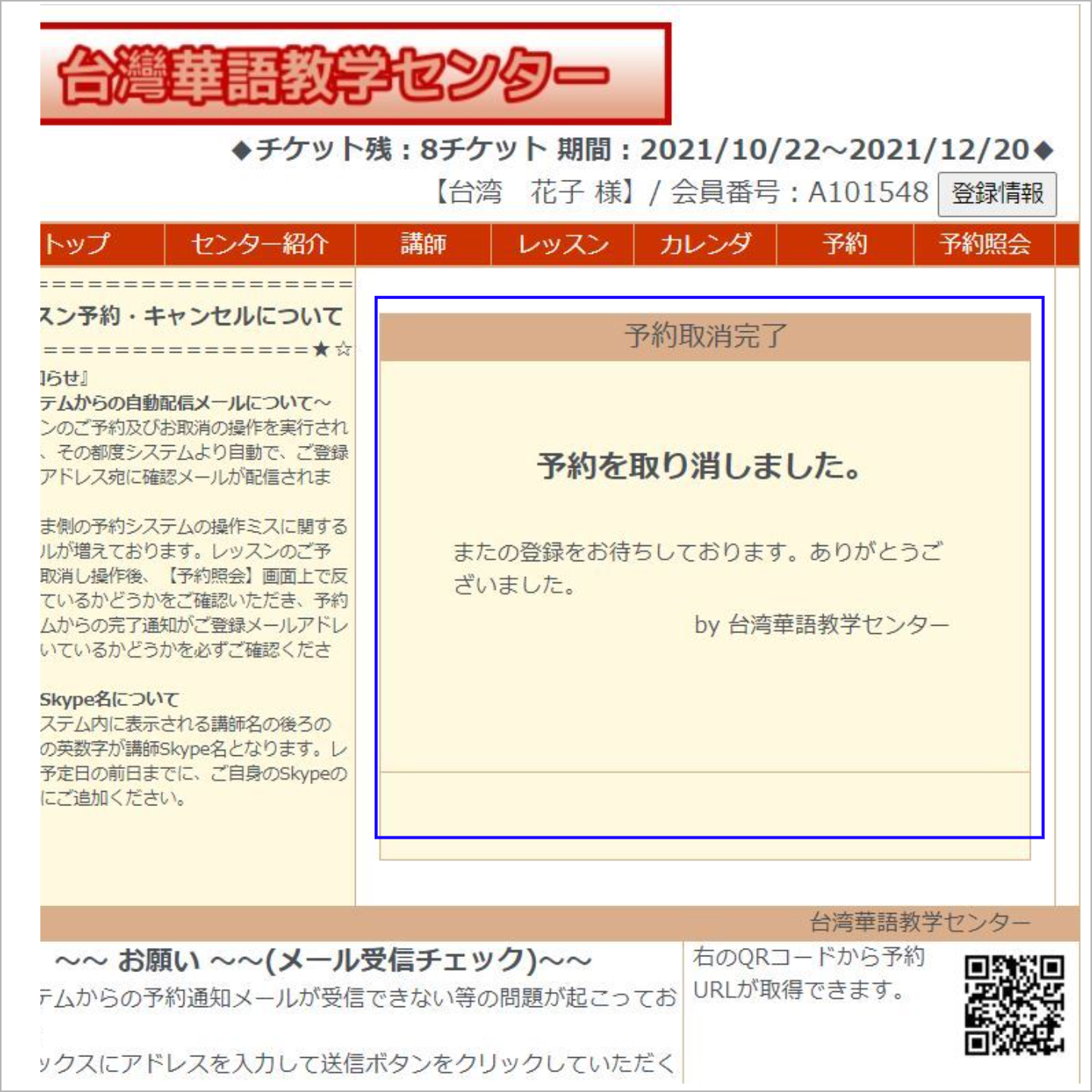 当該予約の「予約取消」ボタンをクリックしたら取消完了です。予約取消ができない予約は既に開始予定時間の12時間前を過ぎている、またはレッスンチケットの有効期限が切れているため取り消しできません。